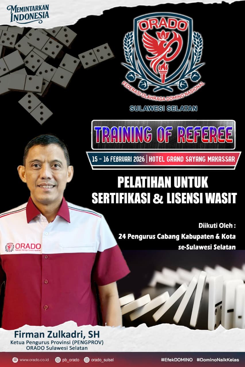 Pojoksulsel.com, Makassar — Organisasi Olahraga Domino Indonesia (ORADO) Provinsi Sulawesi Selatan akan menggelar kegiatan Pelatihan Sertifikasi dan Lisensi Wasit yang dijadwalkan berlangsung pada 15–16 Februari 2026 di Hotel Grand Sayang, Makassar. Kegiatan ini akan diikuti oleh perwakilan dari 24 pengurus cabang kabupaten dan kota se-Sulawesi Selatan.